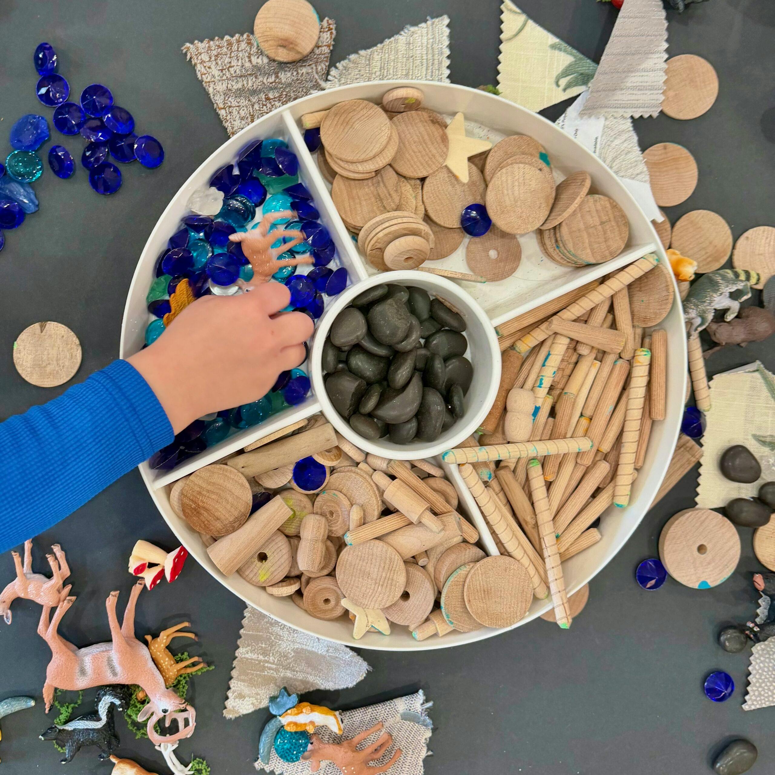 Light is one of the most important tools in a Reggio-inspired classroom. Natural light is prioritized wherever possible, and light tables or translucent materials invite children to explore shadows and color. Rather than plastic toys, you are more likely to find baskets of stones, wooden blocks, shells, and fabric. All are open-ended materials that do not prescribe a single use and allow children’s creativity to lead.